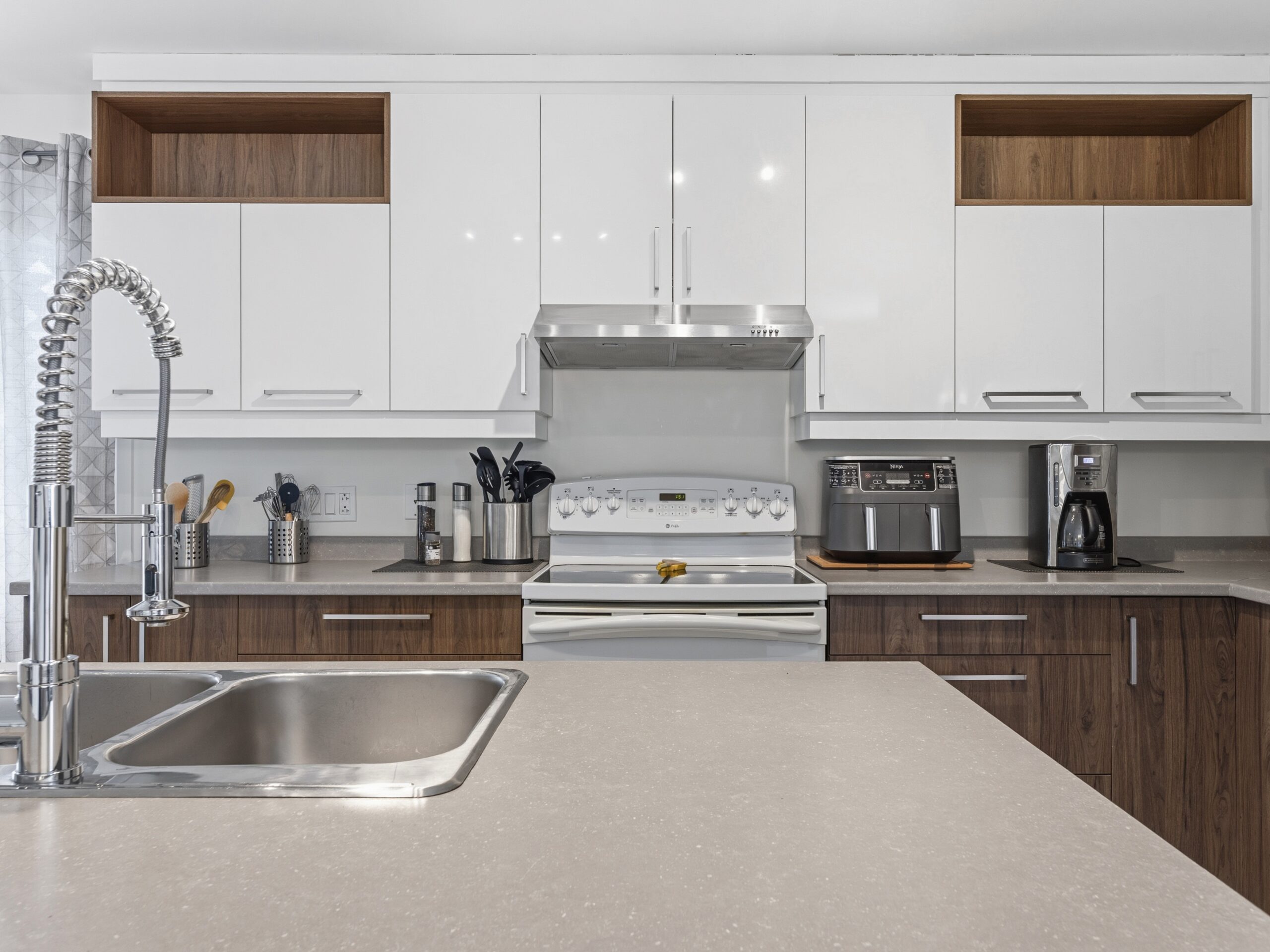 - Dans les armoires de cuisine il y a des tiroirs au lieu des tablettes;